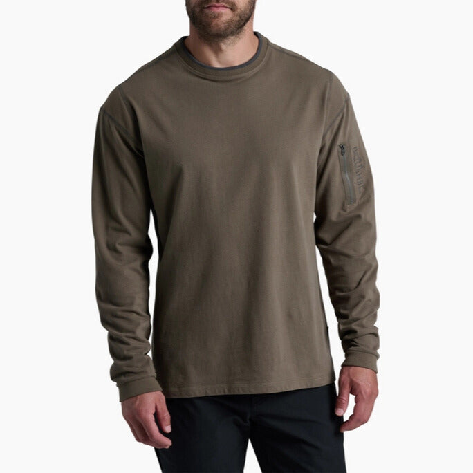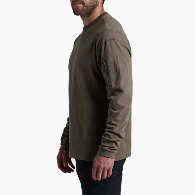 Midweight, year-round performance. Easy care, wash, and wear. Upper left sleeve zip stash pocket. KÜHL signature thumb loops. Flatlock seams for next-to-skin comfort, strength, and reduced bulk. Triple needle top stitch. River washed. Premium fit.