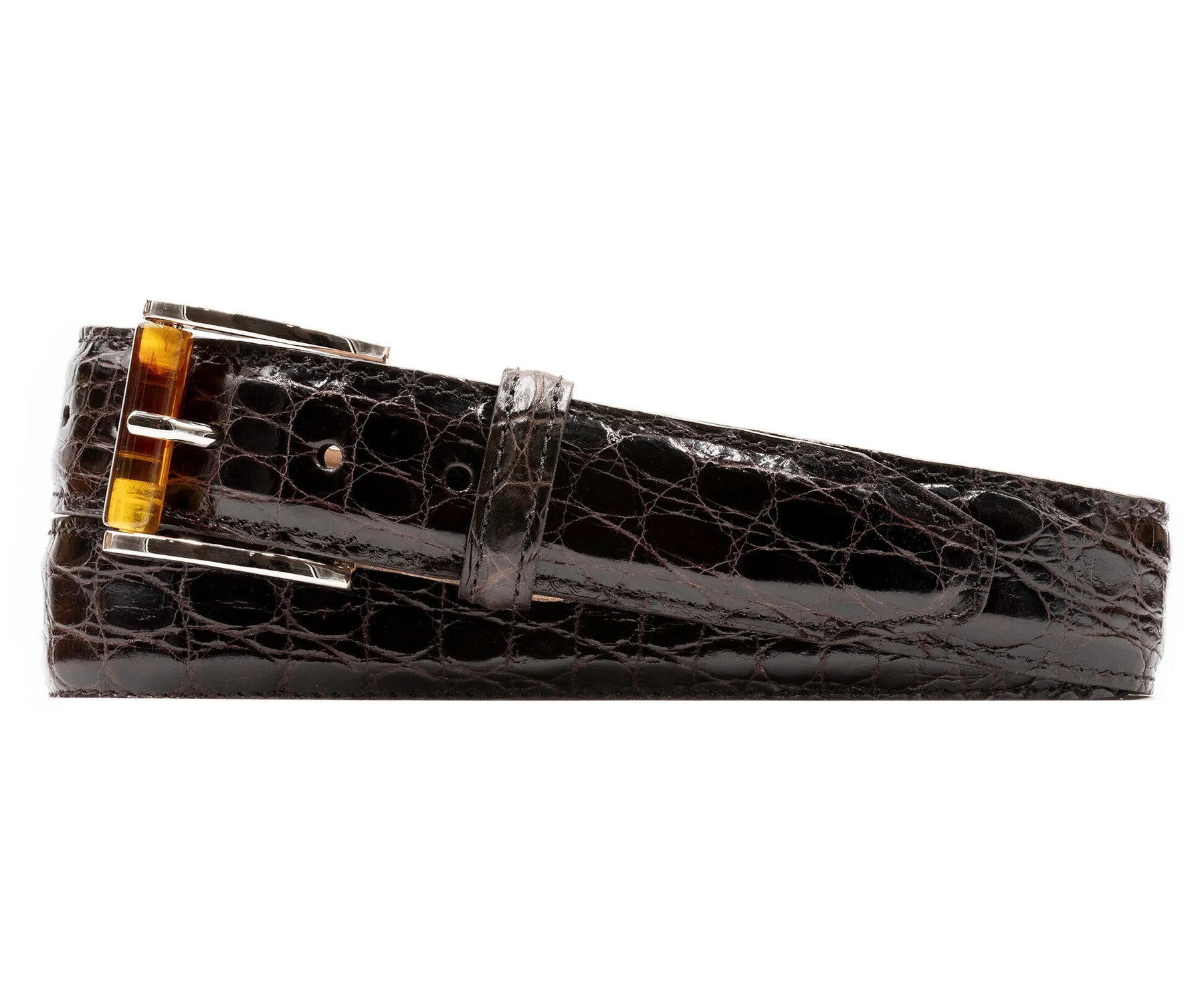 1⅜” width, glazed, genuine freshwater crocodile leather. Equestrian saddle leather lining. Interchangeable polished nickel dress buckle & tortoise roller buckle.
