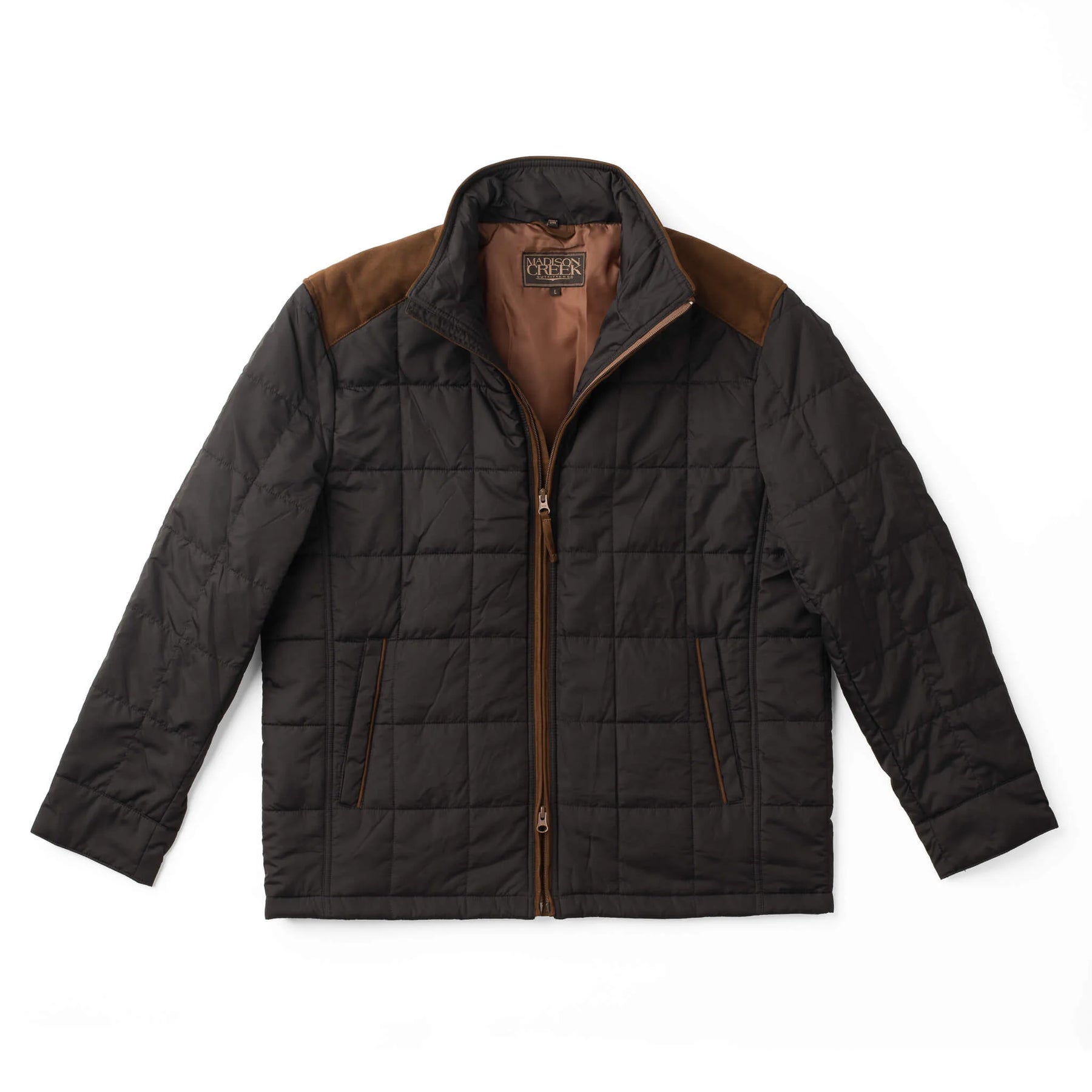100% Nylon - Quilted, Water & Wind Resistant, with lightweight 2oz. Polyfill. Microsuede trim on back yoke & front piping. 2 lower slant pockets with magnet closure.