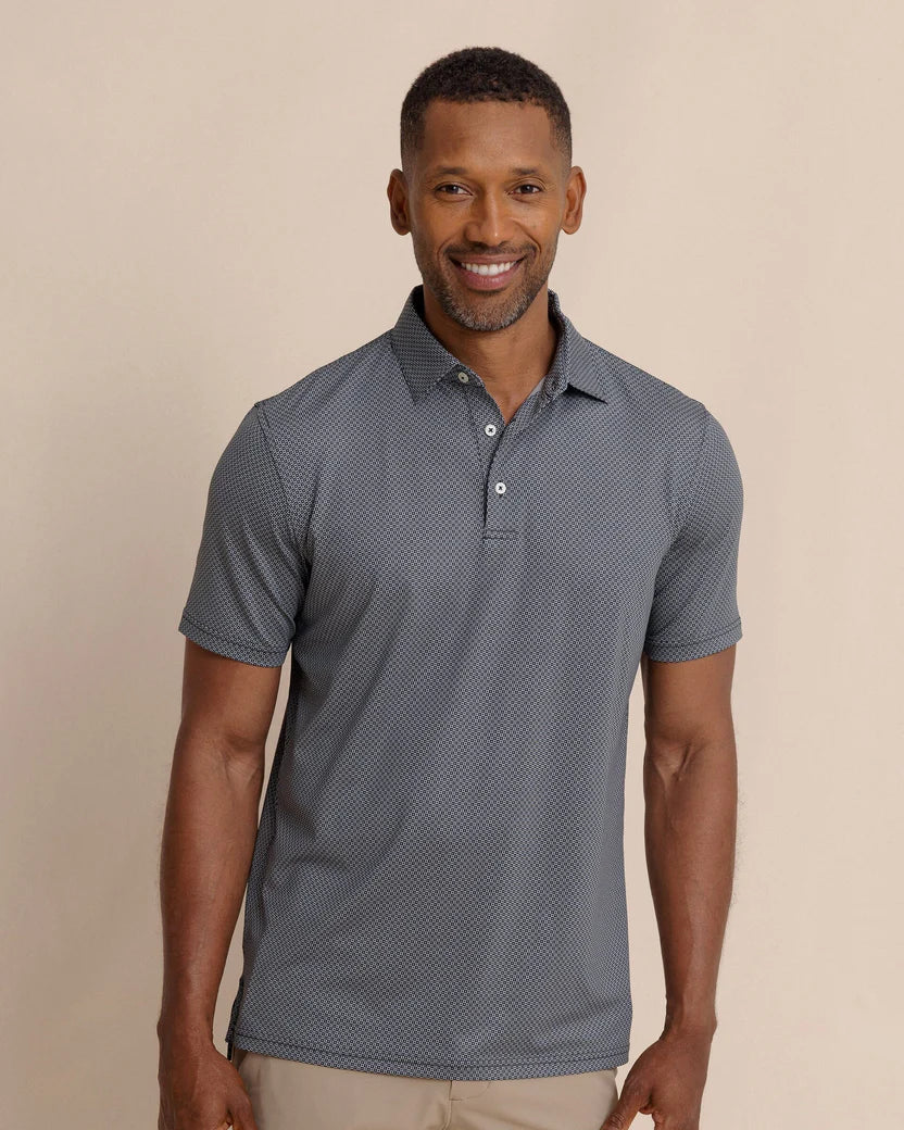 94% Recycled polyester, 6% Spandex. Self-collar, 3-button placket, and drop-tail hem. Internal collar stays in collar and branded imitation mother-of-pearl buttons.