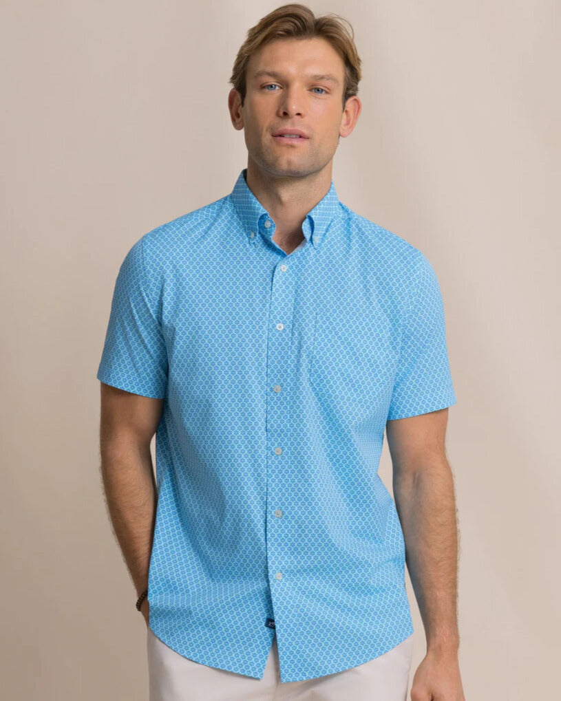 Button-down collar. Left chest pocket. Branded imitation mother-of-pearl buttons. Skipjack flag label at bottom left hem. Features moisture wicking, UV protection, and quick-dry performance.