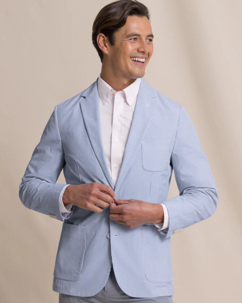 Half-lined back. Knit gussets at underarm. Side vents. Tonal wool felt at under collar. Contrast printed tape at interior seams and lining edge. Mitred sleeve vent with decorative buttons. Welt left chest pocket. Two front patch pockets. Three interior horizontal welt pockets, right side with button closure.